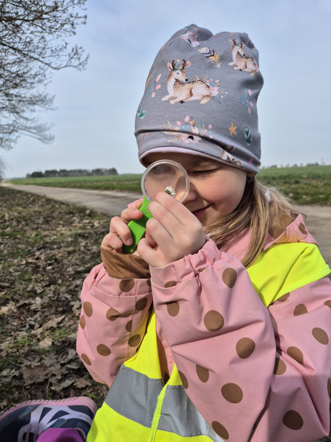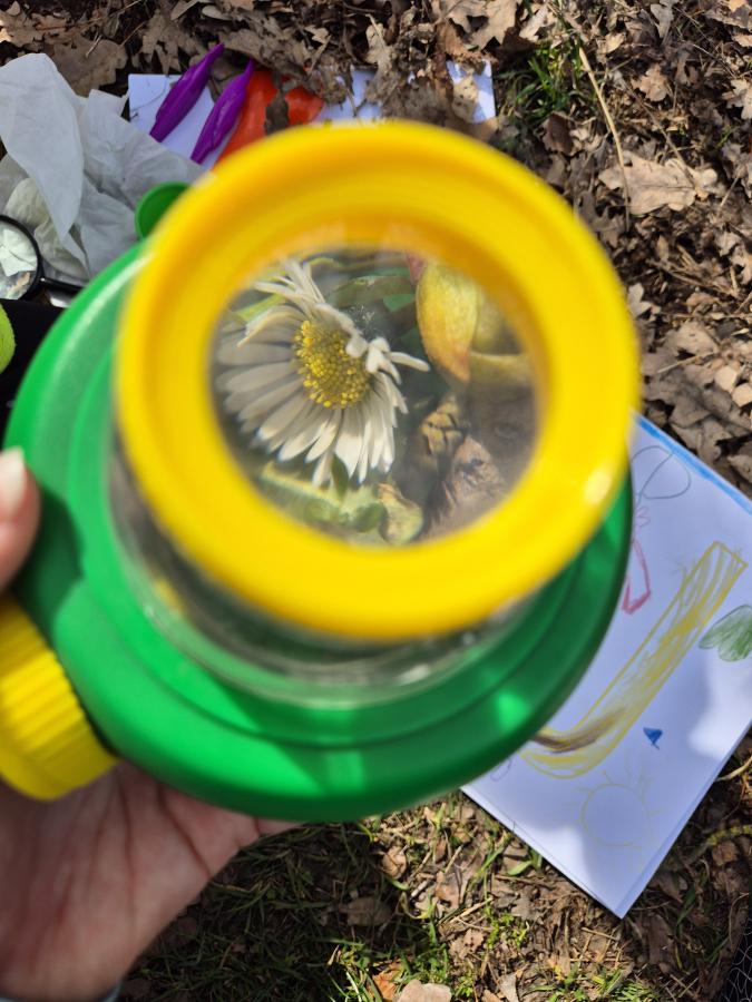V lesním ateliéru děti zakreslovaly jarní pupeny a první květiny, které jsme po cestě objevili. Pozorovaly jejich tvary, barvy i drobné detaily a učily se vnímat přírodu opravdu zblízka. V centru Pokusy děti zkoumaly nalezené přírodniny pomocí lupy a přenosného mikroskopu. S velkým zaujetím objevovaly strukturu listů, kůry i drobných květů a vytvářely zajímavé obrazce. V centru Kostky se tentokrát nestavělo z klasických stavebnic, ale z klacků, šišek a dalších přírodnin. Společně vytvořily jarní bránu, ze které měly velkou radost. V centru Knihy a písmena děti zdobily písmena ze slova JARO a hravou formou si upevňovaly vztah k jazyku.